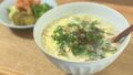 - 温泉卵をつくる。小さめの器に卵と水を少し入れ、箸で黄身を1度刺したらレンジで40秒加熱。
