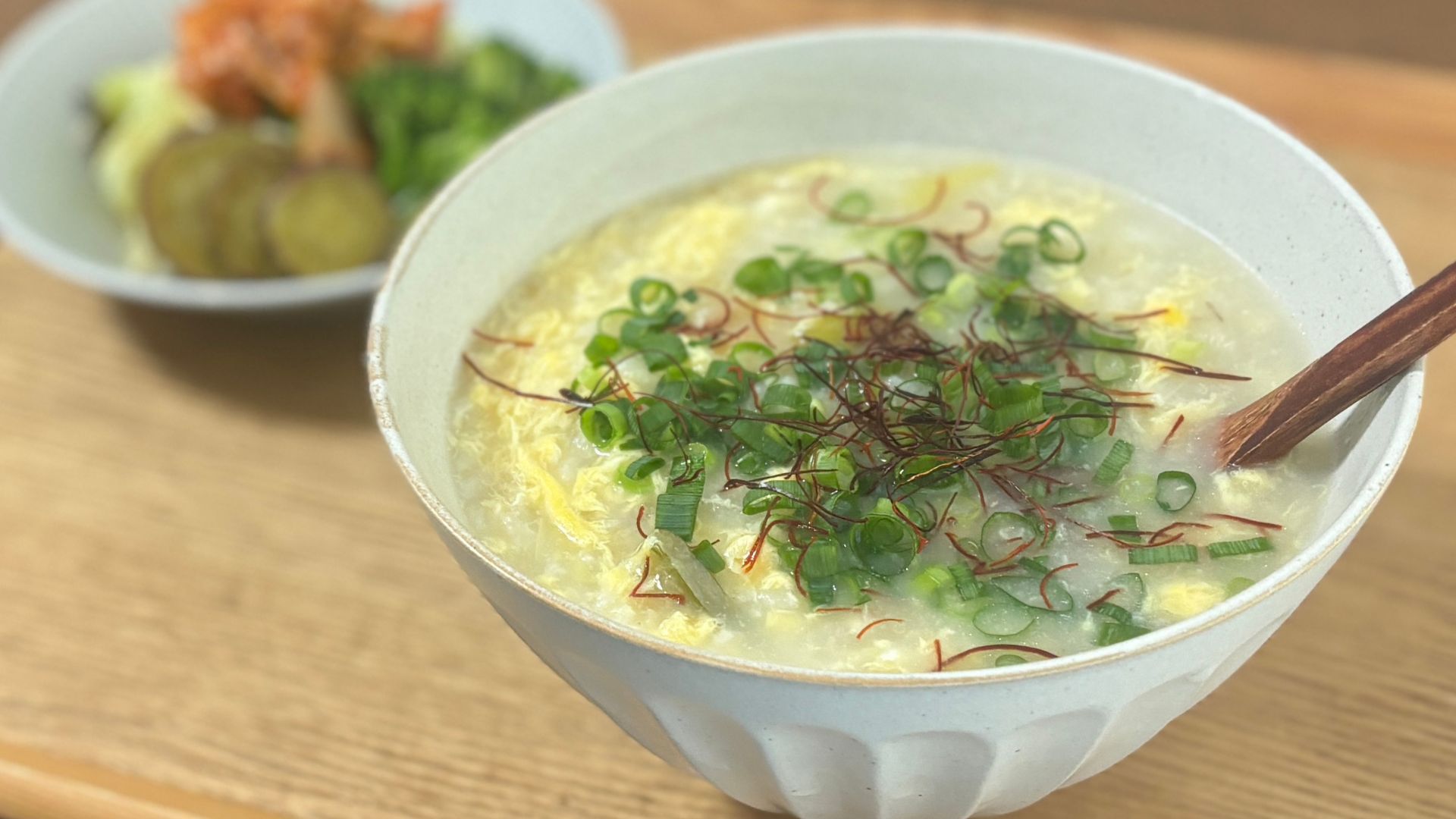 - 器にごはんを盛りつけてスープをかけ、お好みでトッピングをしたら完成!