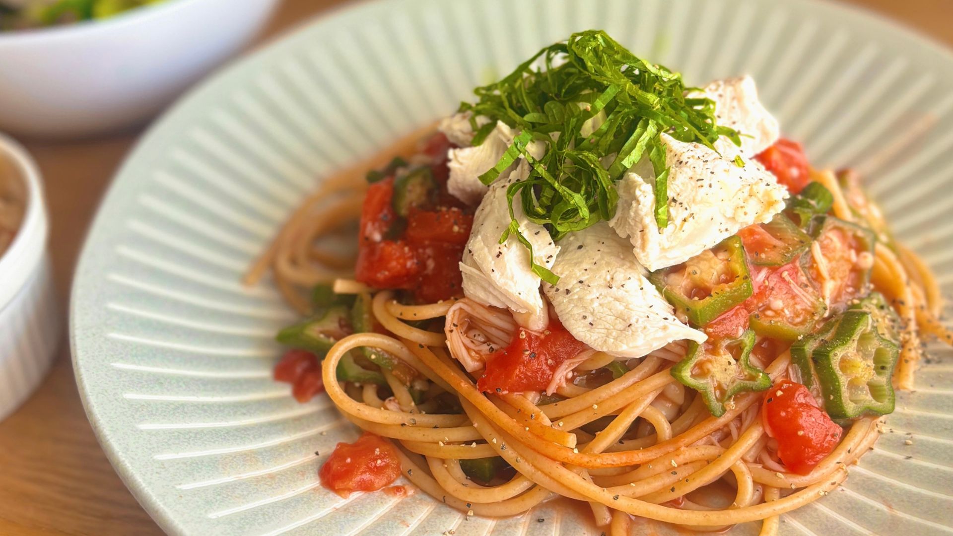 - お皿に盛りつけて鶏ハムと大葉をトッピングし、黒こしょうをふって味を整える。